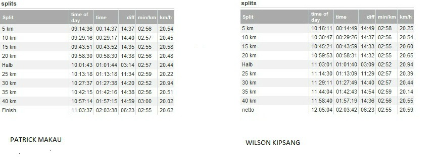In my opinion is interesting to make an analysis between Patrick Makau and Wilson Kipsang:to try to understand where in Berlin was possible to get WR and where in Frakfurt was lost it.Makau started with a fast 5k at begininng,where in run 14’37” instead 14’49” of Kipsang.A gap of 22sec going down km by km and being 9 sec at 10k,7sec at 15k,only 1sec at 20k!!!