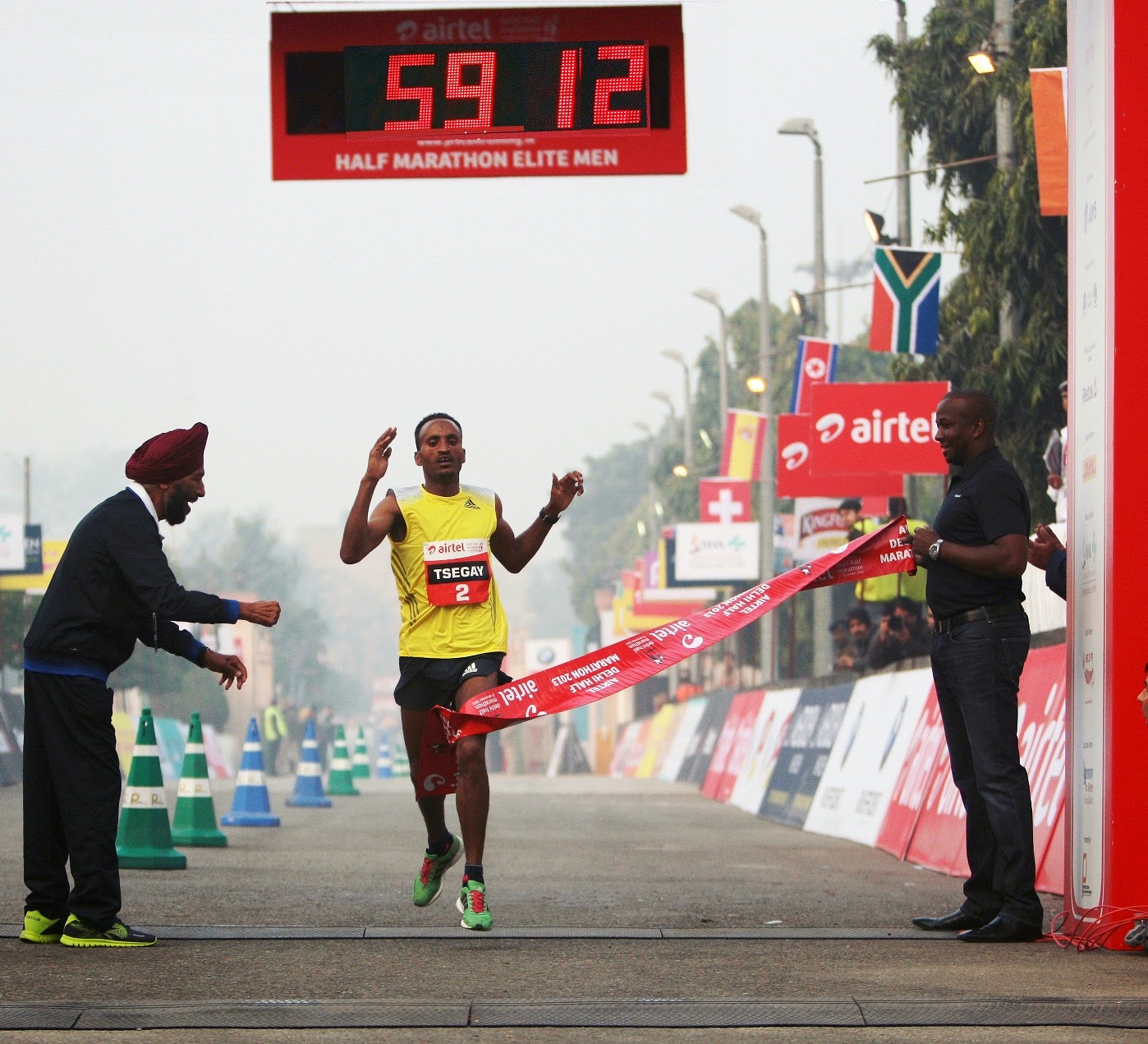 Ethiopian Atsedu Tsegay demolished a highly competitive men’s elite athlete field and also set a new Course Record to win the Airtel Delhi Half Marathon on Sunday.