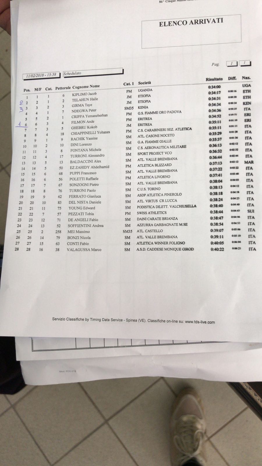 Secondo sul traguardo Haile TELAHUN, mentre terzo si è piazzato Taye GIRMA. Primo degli italiani al traguardo è stato uno splendido Yemaneberhan CRIPPA, giunto al traguardo al quinto posto. Il giovane atleta lecchese ha lottato sino all’ultimo a fianco dei migliori, cedendo solamente nelle ultime fasi.