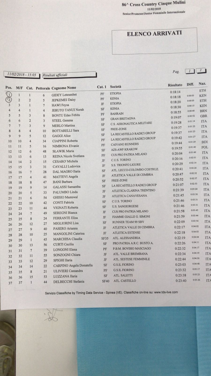 Tra le donne, la gara è stata ugualmente combattuta ed ha visto trionfare solo nelle battute finali Letesenbet GIDEY, con il tempo di 18:14, confermando il pronostico che la vedeva tra le favorite della vigilia. Sui sei chilometri previsti per la gara Senior femminile odierna, l’atleta etiope ha preceduto la keniana Daisy JEPKEMEI e l’altra etiope Feysa HAWI. Tra le atlete azzurre presenti oggi, la migliore è stata Martina MERLO con un brillantissimo settimo posto.