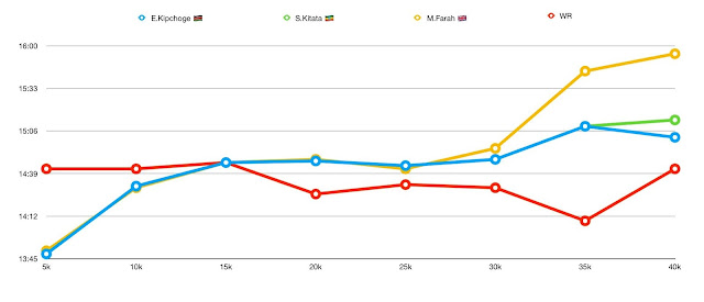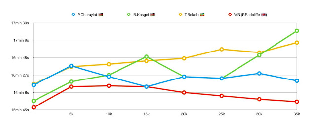 Qui un analisi dei passaggi ogni 5km dei primi tre uomini rispetto al WR di Kimetto a Berlino 2014: