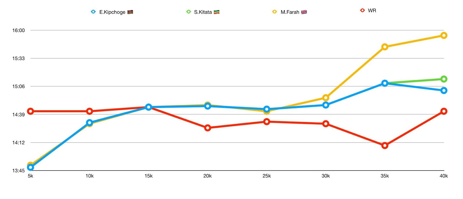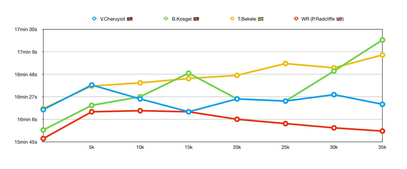 Qui un analisi dei passaggi ogni 5km dei primi tre uomini rispetto al WR di Kimetto a Berlino 2014: