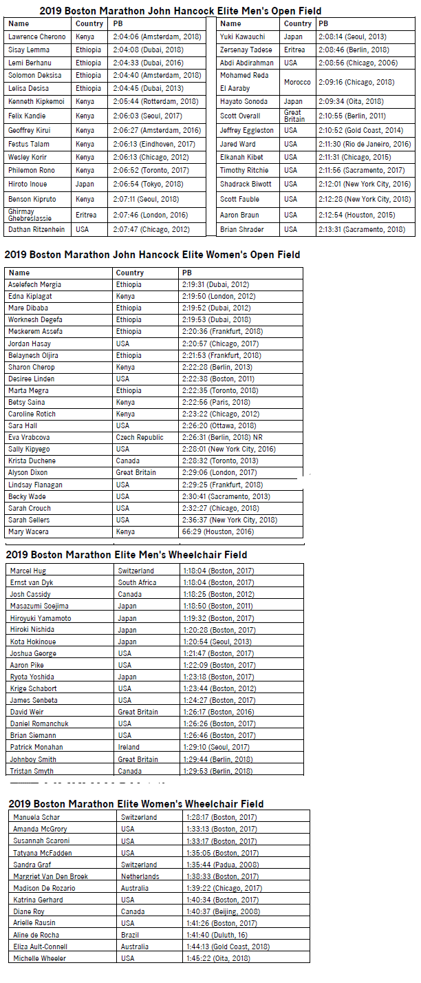 Among those making their Boston debuts are several men who ran their personal best times in 2018: Rotterdam winner Kenneth Kipkemoi of Kenya; two-time Toronto champion Benson Kipruto of Kenya; and Beirut winner Mohamed Reda El Aaraby of Morocco.