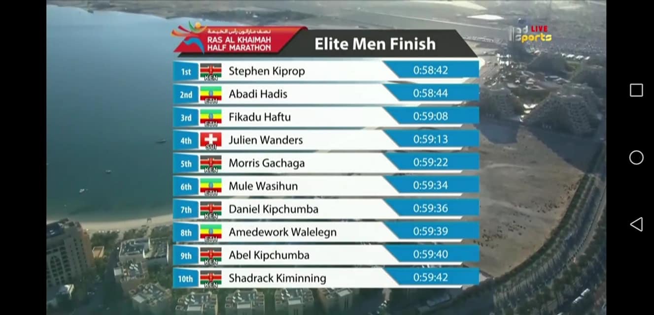 The victory went to Stephen Kiprop who crossed the finish line on the fast course in the United Arabian Emirates in 58:42.