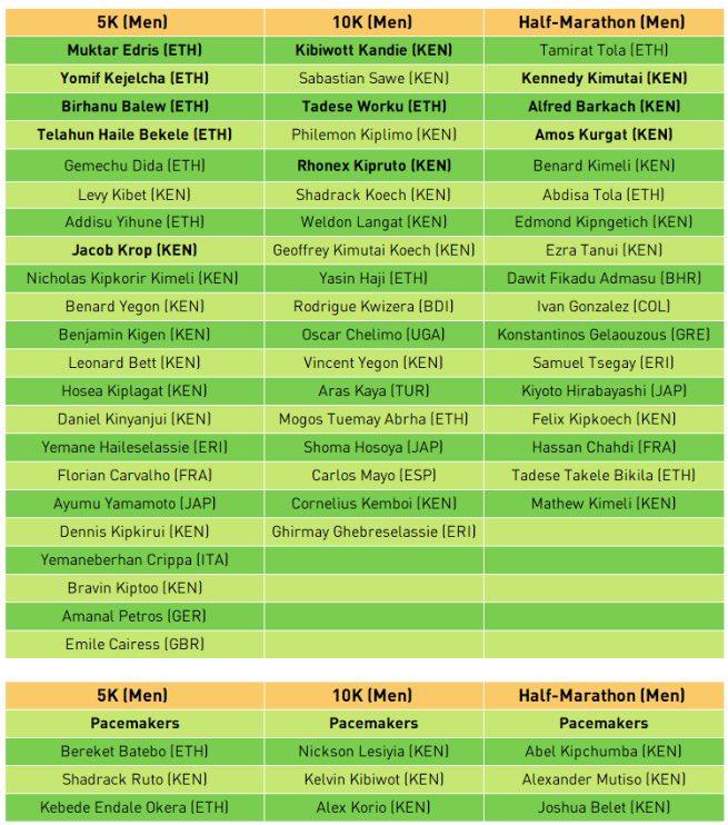 Tamirat Tola and Kennedy Kimutai will be the top but possible many surprises: first brother of Tamirat Abdisa. Many other names who can run really fast. If confirmed , pacers as Kipchumba, Mutiso and Belet will be very soldi pacing group who can help guys to run fast fast.