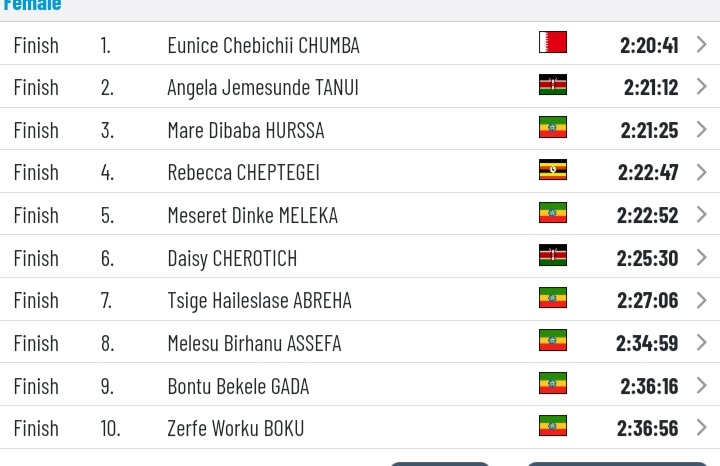 finishing the 42.2km contest in 2:20:41, ahead of Kenya’s Angela Tanui (2:21:12), with Ethiopia’s Hurasa