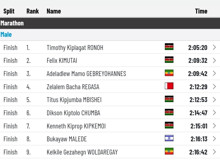 Timothy Kiplagat won the men’s category with a time of 02:05:20